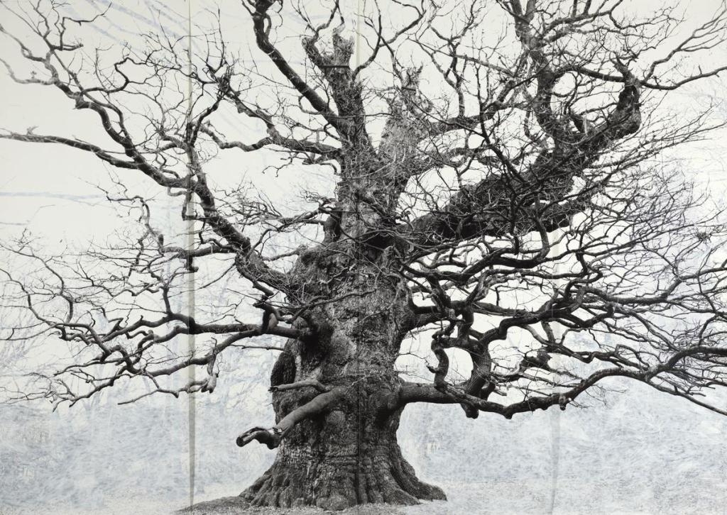 Walking through the park I imagine the patterns the trees would leave riddling through the casting material. The wind shivers and shakes the leaves and the whole arrangement shifts, the negative spaces reorganizing, and I am conscious again of space’s hospitality, its provision for endless rearrangement. Without lag or delay, airy light has rearranged itself to pool differently around these branches, accepting them again. Simone Weil imagined the doctrine of creation this way, spatially: God withdraws in order that the world can be. God’s own infinite life somehow limits itself, pours itself out, to make room for something other (Gravity and Grace, 2002, pp.33,41). For Weil, God’s absence from creation is necessary, generous, hospitable. Perhaps God withdraws just far enough, but not further: ceding us space, but filling the absences, the invisible hugging and exactly fitting the visible, as air fits and fills a lung. I think of Tacita Dean’s painted tree photographs, especially the grand oak Majesty. Dean fills all the not-tree spaces with gouache absence. The portrait here is not of the tree but of that bewilderingly delicate absence. Something crackles to imagine the two together, positive and negative, perfectly fitted to each other.